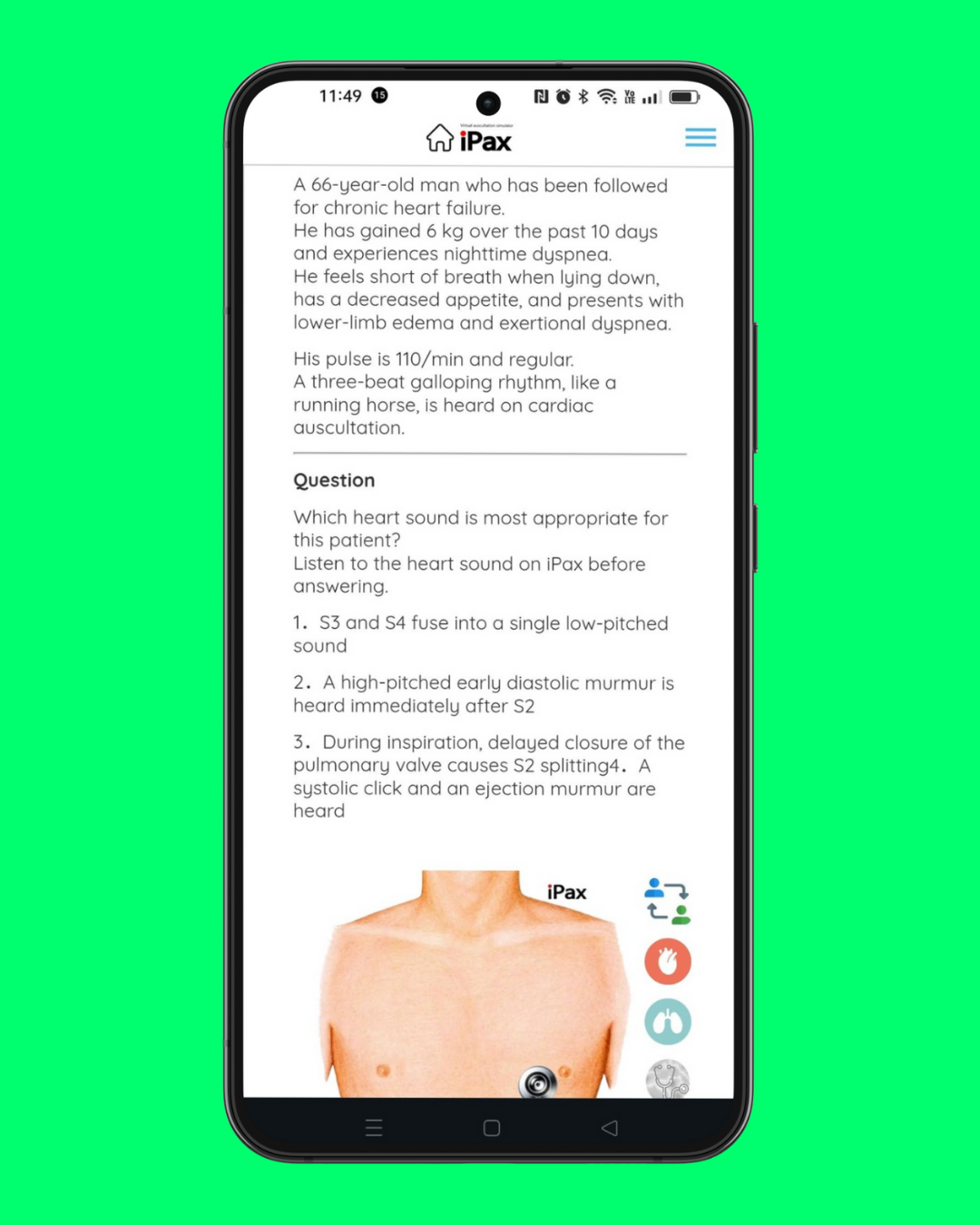 ユーザ登録をすれば無料で聴診クイズをご覧いただけます。 スマートホン画面に表示された胸部イラスト(またはプレイヤー)をタップするとその部位の音が聴こえます。選択肢からあなたの答えを選んでください。すぐに正解と解説が表示されます。