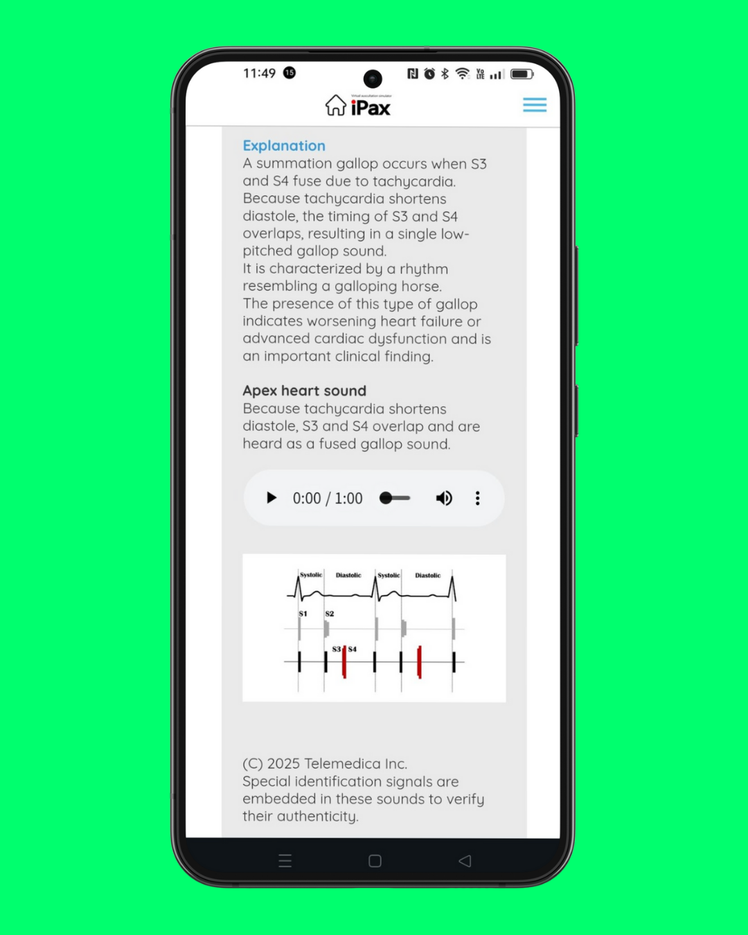 ■11月17日は、心不全の増悪時にみられるサメーションギャロップを学びます。頻脈によって拡張期が短くなり、S3とS4が一つの低調な奔馬調として聴こえる特徴的な心音です。実際の音を確認しながら、重症心不全を示唆する重要なサインを理解しましょう。