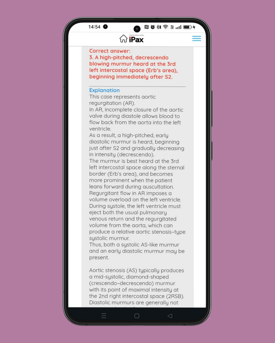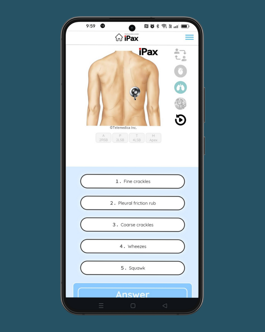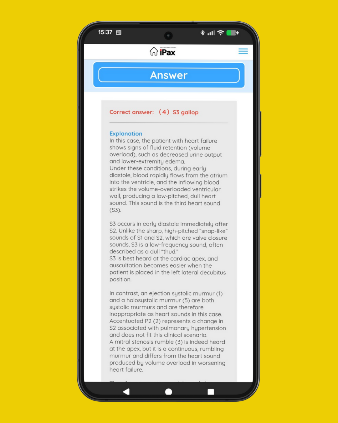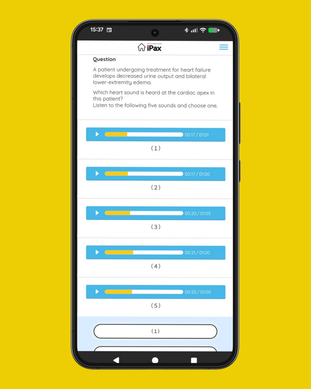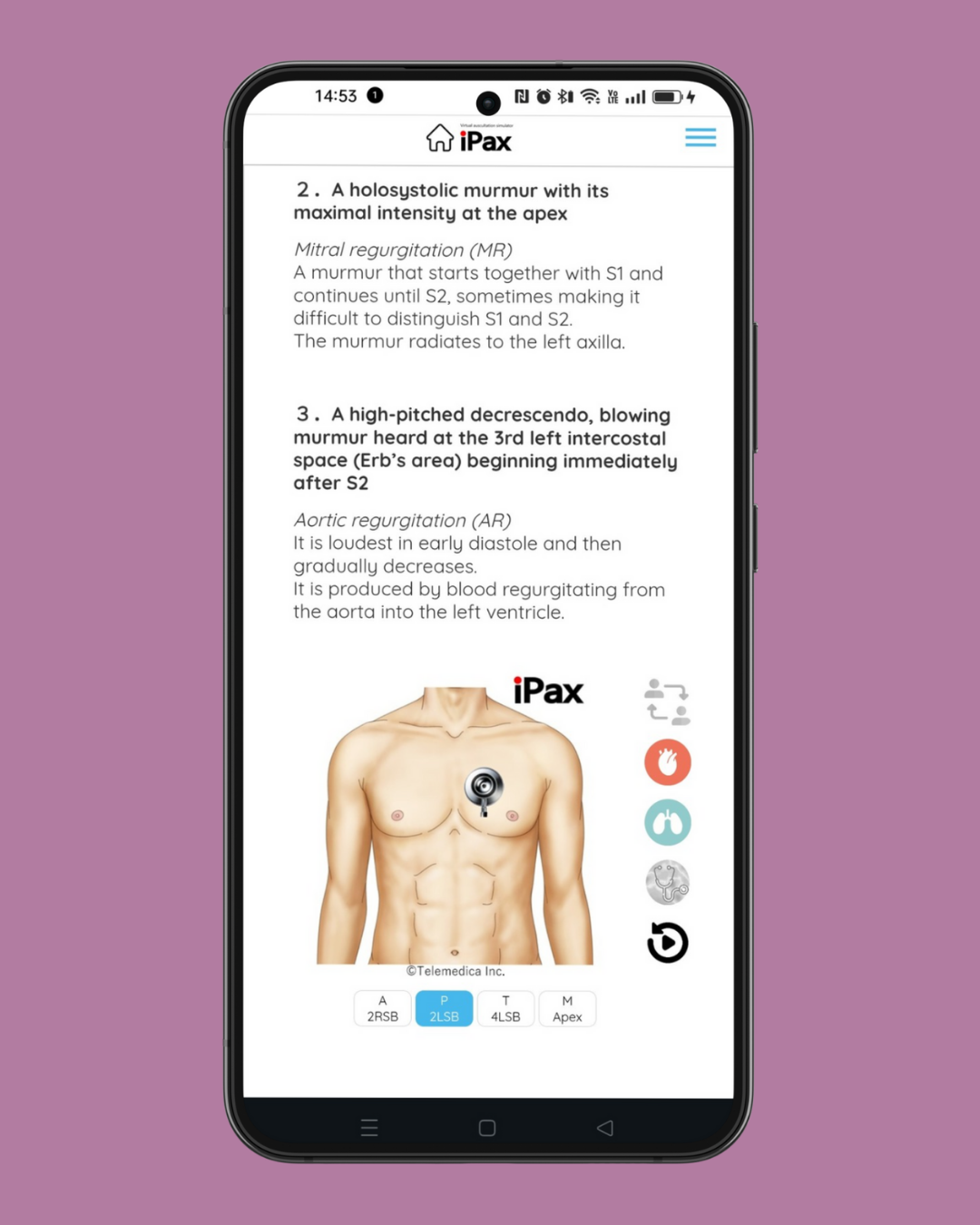 ユーザ登録をすれば無料で聴診クイズをご覧いただけます。 スマートホン画面に表示された胸部イラスト(またはプレイヤー)をタップするとその部位の音が聴こえます。選択肢からあなたの答えを選んでください。すぐに正解と解説が表示されます。
