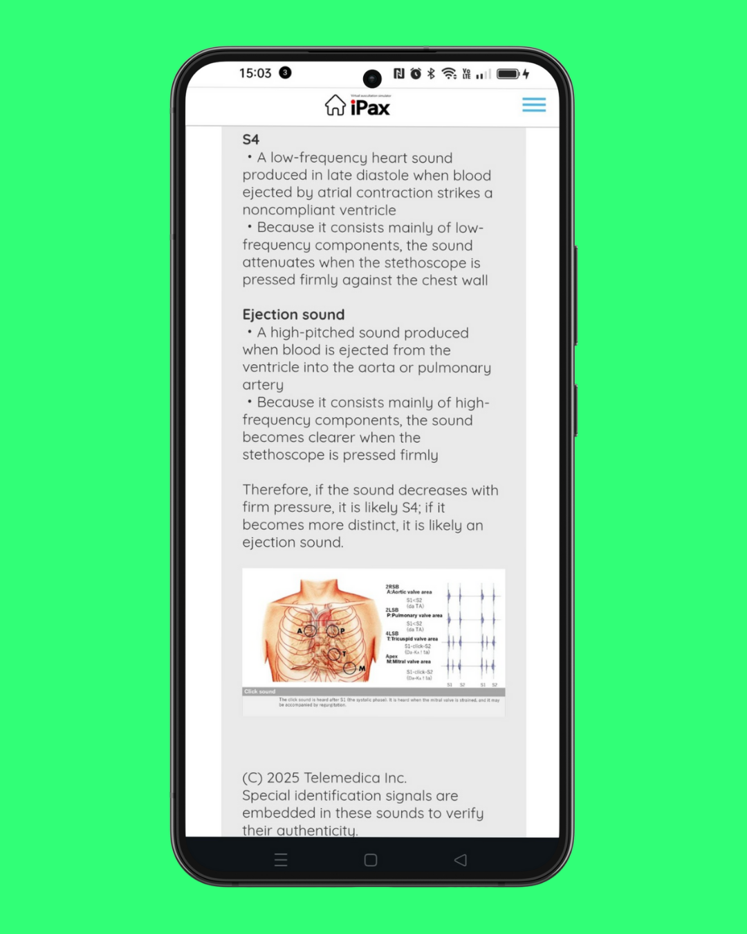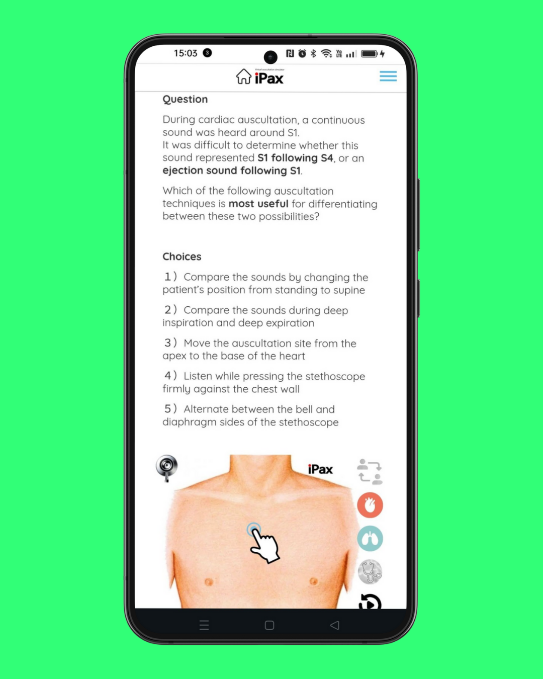 ユーザ登録をすれば無料で聴診クイズをご覧いただけます。 スマートホン画面に表示された胸部イラスト(またはプレイヤー)をタップするとその部位の音が聴こえます。選択肢からあなたの答えを選んでください。すぐに正解と解説が表示されます。